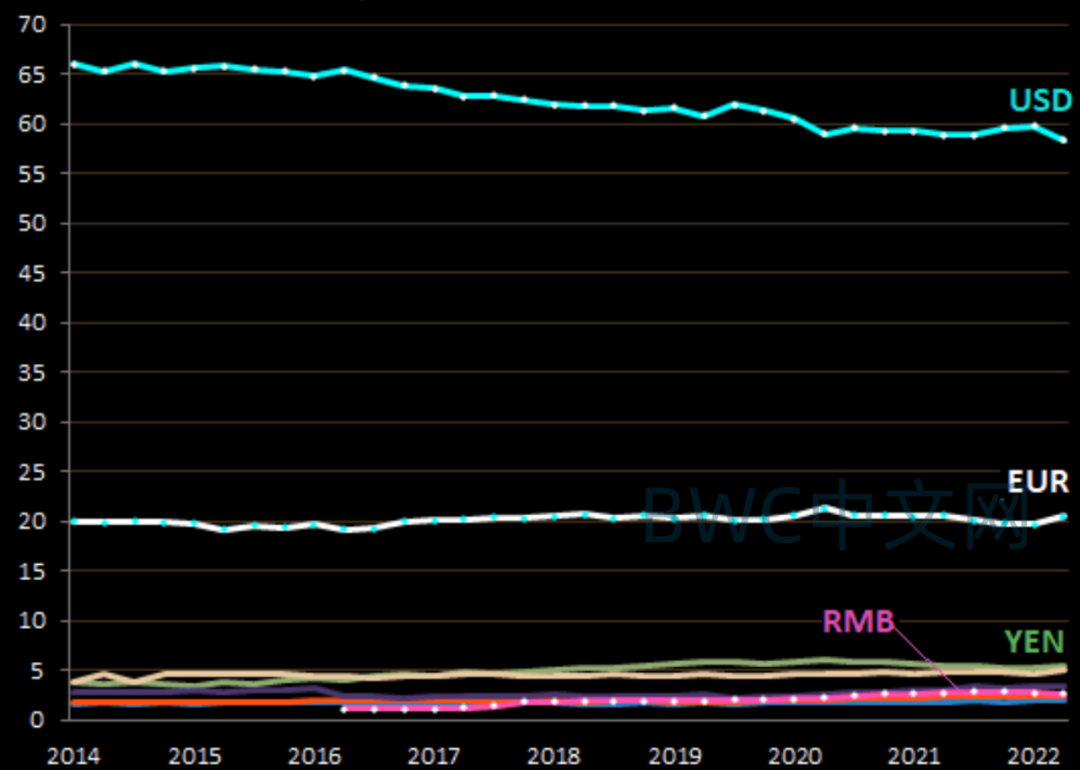不过,通过欧元后来的诞生,可以看出,美国阻挠欧洲去美元化并没有成功。如下图,多年以来,欧元作为全球第二大储备货币占比为20.5%,仅次于美元59%的全球占比。虽然欧元区成员国高达20个,但换个角度来理解,如果欧元当年不问世,这20.5%储备份额可能会被美元占据相当大的一部分。