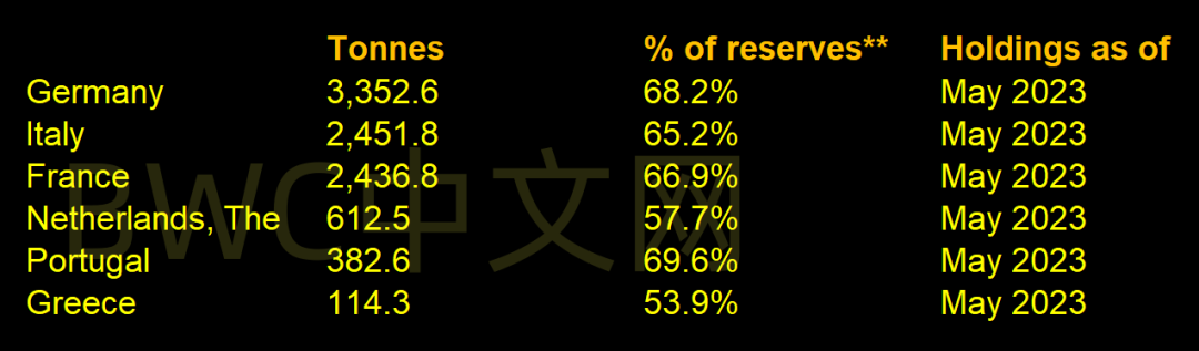不仅于此,欧洲多国一直高度重视黄金储备,通过下图,可以看到,德国、意大利、法国、荷兰、葡萄牙、希腊这6个具有代表性的老牌欧洲国家,黄金储备在外储中占比最少的为希腊,但还是高达53.9%,其次是荷兰的57.7%,而德法意及葡萄牙的黄金储备在外储中占比都超过65%,甚至更高。与拥有美元储备地位的美国黄金储备占比高达68.9%都非常接近。
