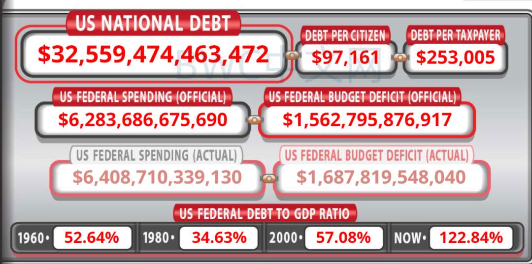 而即便如美国国债时钟公开的32万亿美元这一规模,但平均每个美国纳税人依然要为此背负高达253002美元债务,而包括非纳税人在内的平均每个美国人则背负约9.7万美元债务。