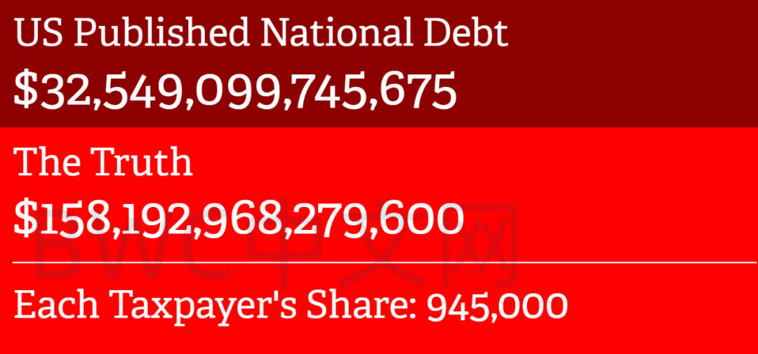 比如,我们查询金融机构财务真相公布的报告显示,截至7月20日,虽然美国联邦公开的债务总额超过32万亿美元,但真实的债务总额却高达158.2万亿美元,相当于平均每个美国纳税人为此背负945,000美元债务。