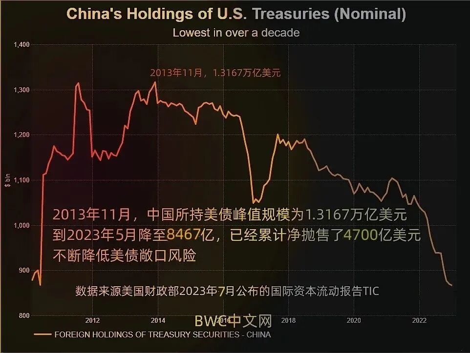 据美国财政部7月19日最新公布的数据显示,在此期间,中国所持美债规模已经加速刷新至十三年以来的新低至8467亿美元,且保持了连续第十四个月持仓低于万亿美元的状态,正如图表数据所示,最近十年内,中国更是累计抛售了占仓位比例近35%的美债,其中,在过去的24个月内更是加速下降了约23%。