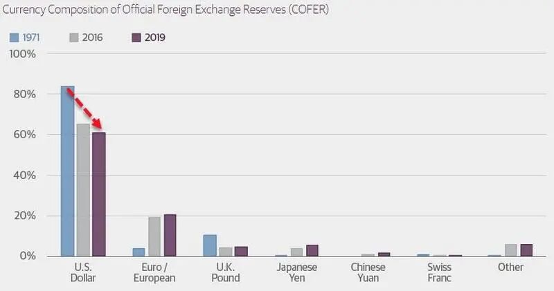 美国议员亚历克斯穆尼在向美财政部提交的有关敦促美联储应恢复金本位的方案中提到,自1913年以来美元已经丧失了96%的价值,平均每过一代人美元就会损失掉50%的购买力,IMF在1月公布的最新数据已经显示美元份额在2020年度意外下降至两年来最低至60.2%,请注意,2000年时该比例曾高达73%。(完)