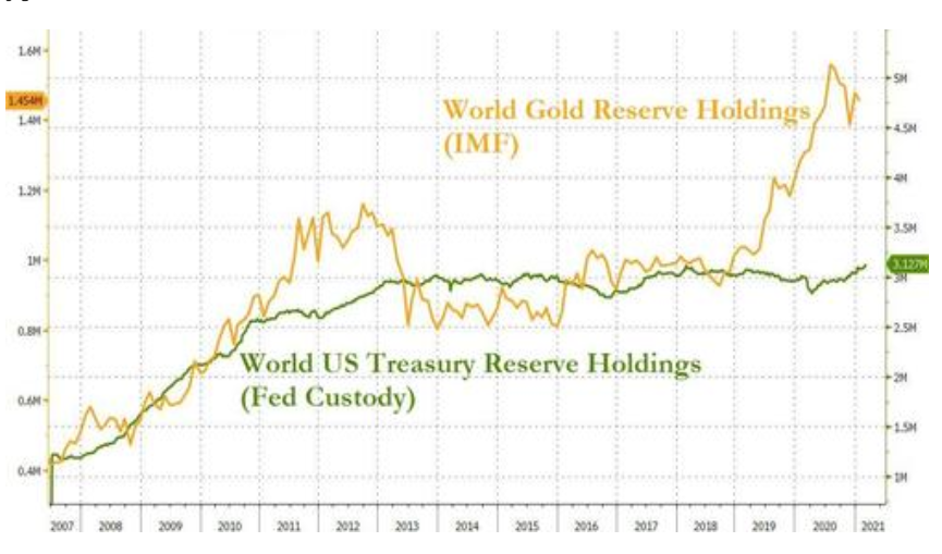 而通过下图,我们可以清晰地看到,全球央行关于美债这一美元核心资产与黄金储备的布局已反生反转式变化。