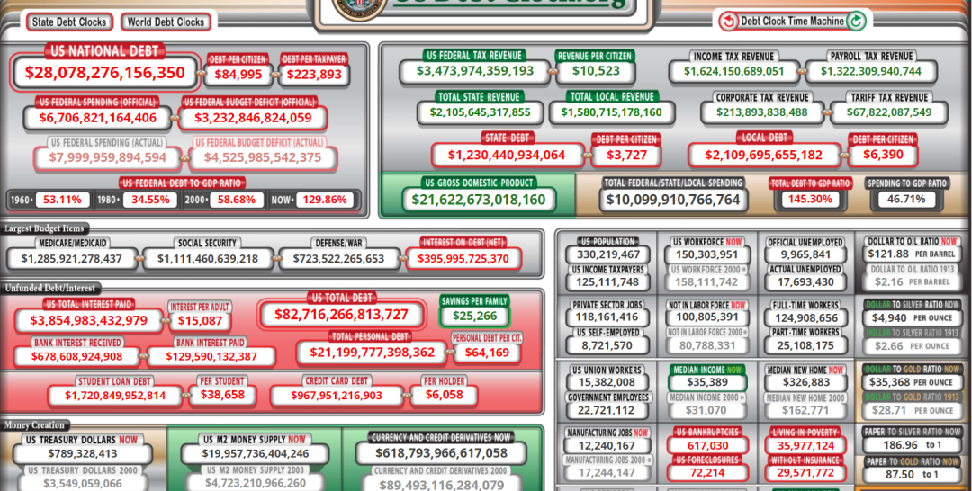 3月22日,如下图所示,美国联邦债务总额已经超过28万亿美元,且正在快速上升,这些数字很可怕,美元世界肯定需要进行金融重组。