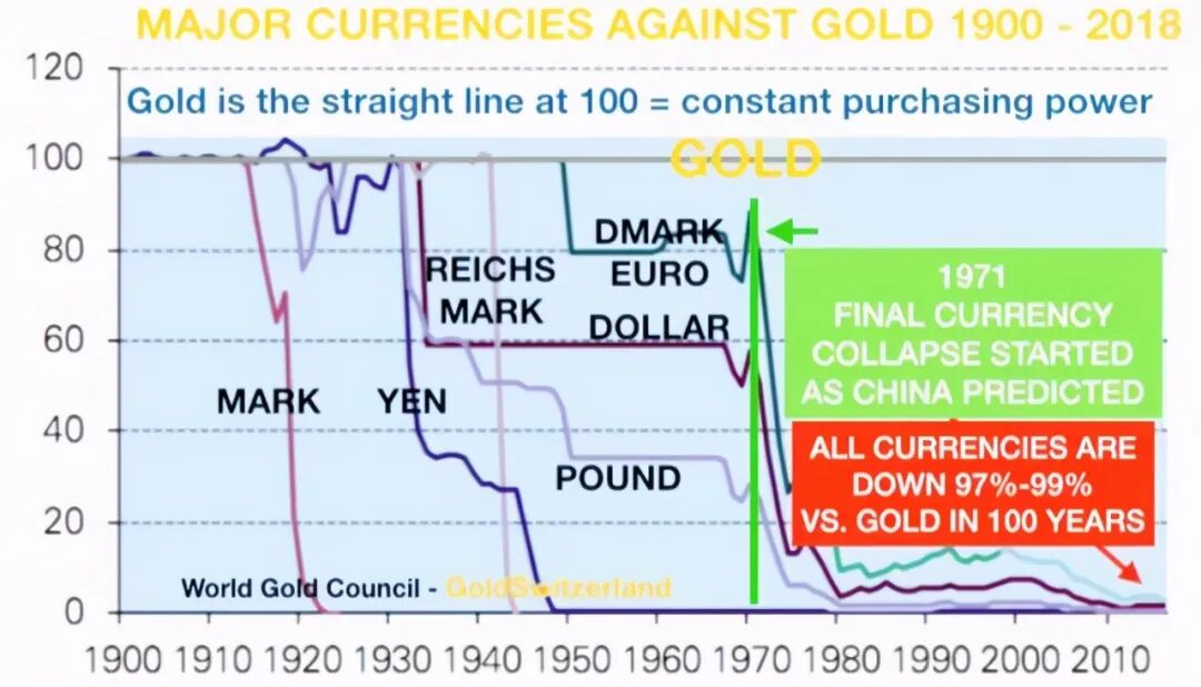 正如BWC中文网财经研究团队所分析的那样,在1913年,1美元可以购买30 颗Hershey巧克力棒,但现在才够买10卷厕纸。按美国西弗吉尼亚州议员,金本位制的捍卫者亚历克斯.穆尼的解释就是,自1913年以来美元已经丧失了96%的价值,相对而言,平均每过一代人美元就会损失掉50%的购买力。