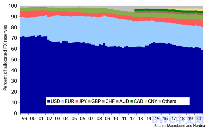 IMF在4月公布的全球国际储备数据已经在显示这个趋势,美元份额在2020年度意外下降至25年以来最低至59%,占比连续三个季度下降,请注意,2000年时美元占各国外储中的该比例还曾高达73%,如果按照这个趋势,我们很快会看到这个数字接近50%。