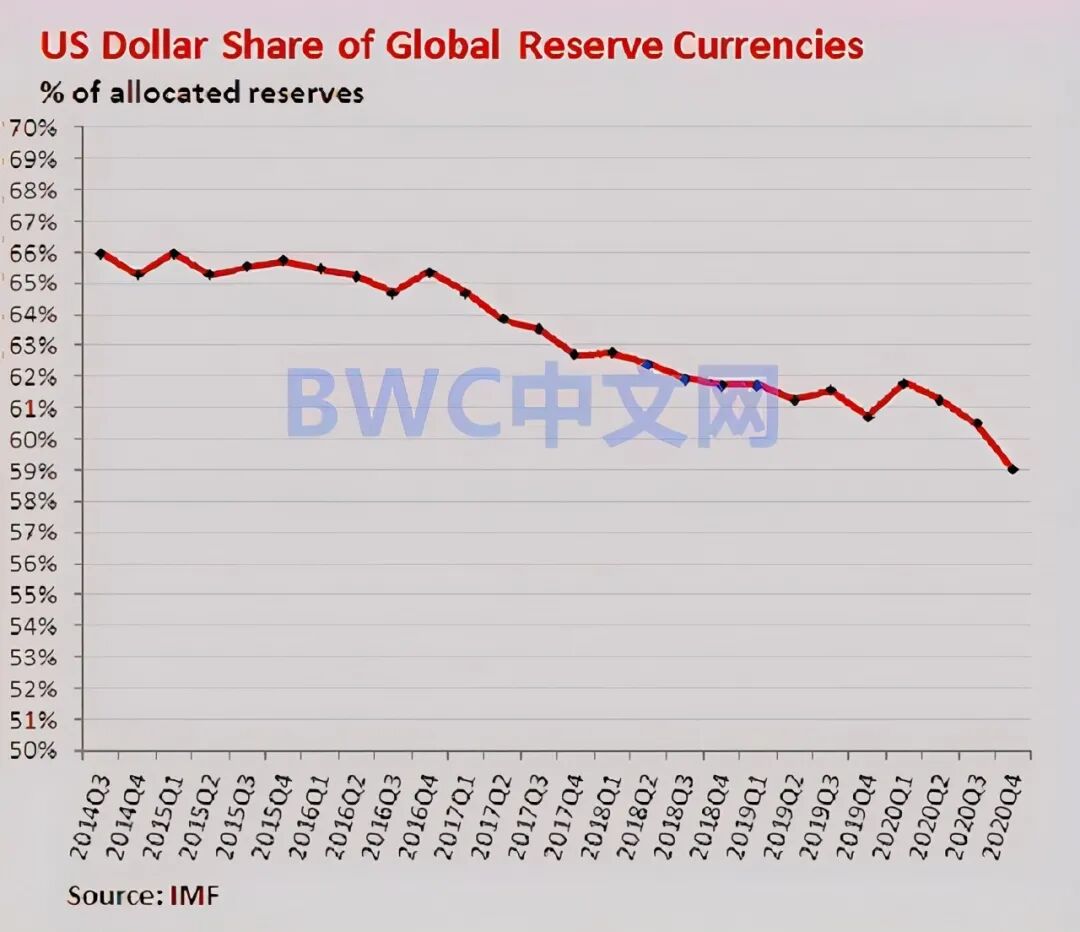 据IMF(国际货币基金组织)最新公布的全球央行国际储备数据显示,截至2020年底,美元在各国外储中的份额意外降至25年来最低,且为连续三个季度下降至59%。