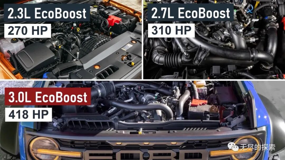 福特Bronco皮卡的定位从它的动力系统上看更明确,三款ecoboost发动机会作为它的动力来源;首先肯定是Bronco猛禽版的3.0升V6必须配置,这是它的动力王牌,也是最能体现Bronco皮卡特性的标志,在福特的性能版多功能车上,3.0T始终是冲锋在前的角色。Bronco皮卡其次装备的是双涡轮增压的2.7T,这也是Bronco混社会的刺身标配,最低排量是2.3T发动机,2.3T在中国市场上已经可以吊打一片了,但是在Bronco皮卡上只是最低配,由此可见Bronco皮卡的产品定位级别是非常高的。