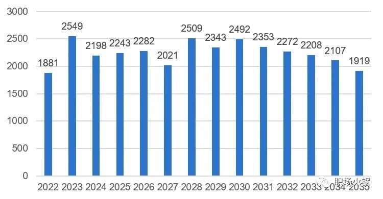 2023年将成为老龄化加速最快的关键一年。1962年三年自然灾害结束后,中国爆发了一波“婴儿潮”。从1962年到1976年,平均每年出生2421万人。看以下图表,从2023年迎来“退休潮”。