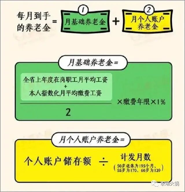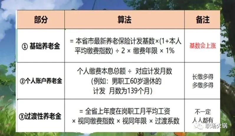 我们拿到手的养老金是有三个部分组成的:基础养老金+个人账户养老金+过渡性养老金(有些人没有)。我们来两个公式,见下图1和2两张表。