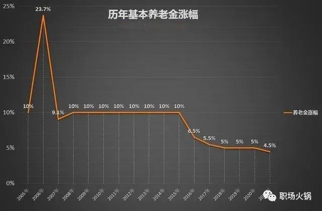 所以,我们看看这几年,养老金上调的涨幅是持续下滑的,从2015年的10%持续下滑到2021年的4.5%,在2022年再创历史新低——4%。可见经济压力和养老金库存的压力还是比较大的。社保专家预测2023年养老金上涨幅度可能在3.4%-4.5%之间,建议我们不要期望值太高。