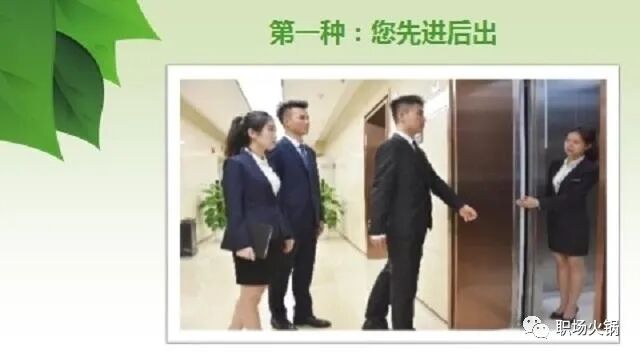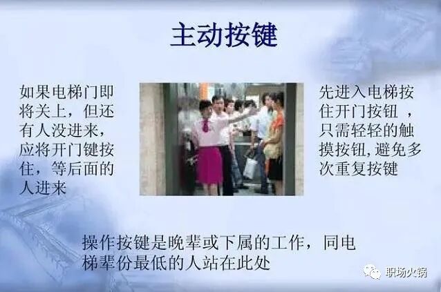第一步,要敏捷地主动打开电梯,别让领导给你打开电梯。如果领导或客人比较多,你要先进入电梯,一手按住“开门键”,一手扶住电梯口,邀请领导进入电梯。
