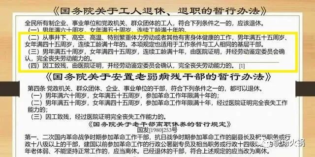 所以,我们从这份文件里可以看出:从事井下、高空、高温、特别繁重体力劳动或其他有害身体健康的工作,男满五十五岁、女工人年满四十五岁,就可以提前退休了。另外,因病和工伤不能工作的,也可以提前退休。