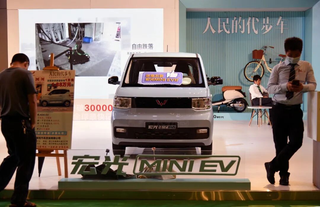 ▲ 宏光mini的展位前经常有人驻足,招牌上写着“人民的代步车”。图 / cfp