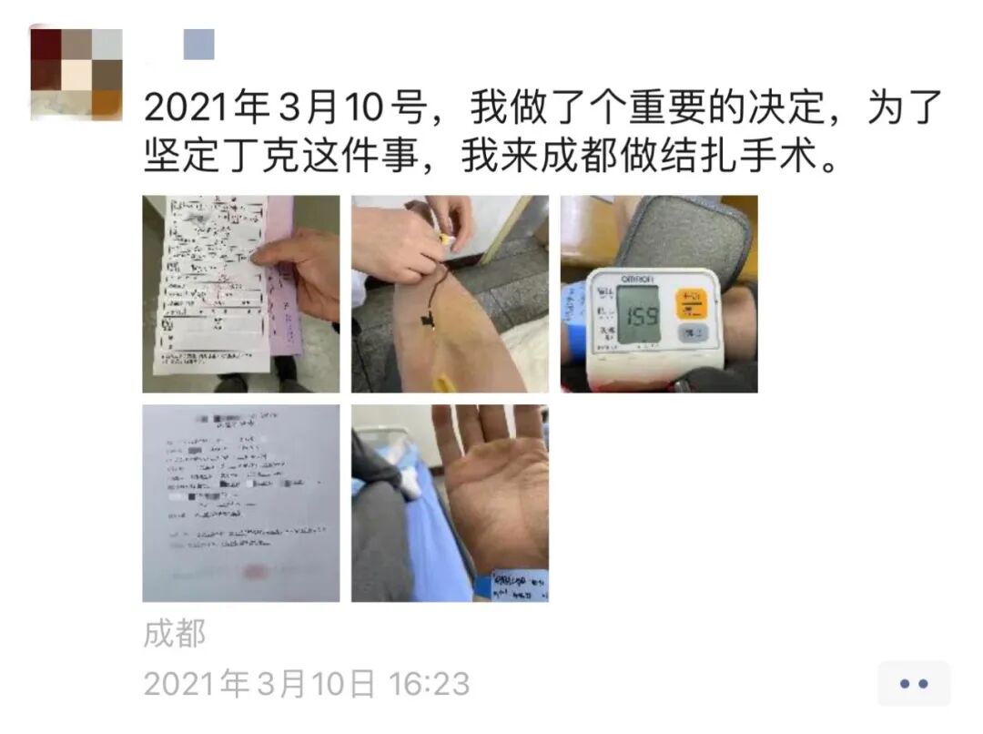 直到2019年底,大林在微博上看到成都某男科医院的医生发表了一篇结扎论文,便私信询问他可否做手术,得到肯定答复后,大林决定去成都,随后疫情爆发。当医生得知大林是一年多前曾在微博上咨询过他的那位患者,现在依然心志坚定,便同意为他手术。大林也是我们找到的三人中唯一没有欺瞒自己未婚未育事实成功预约手术的。
