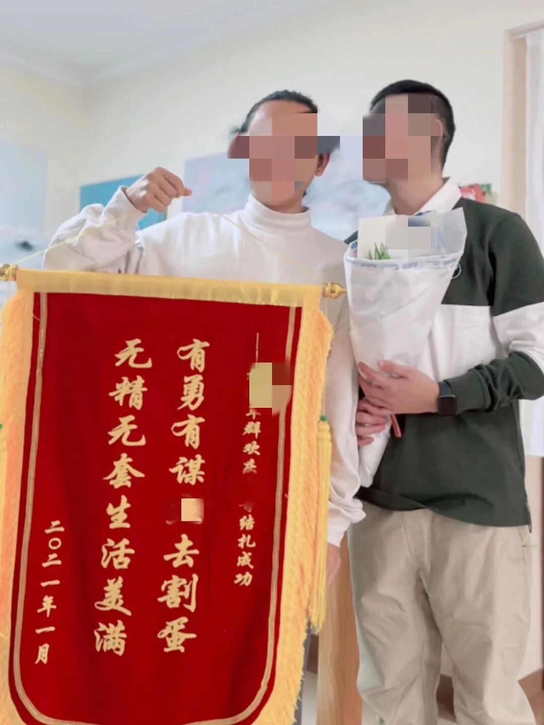 ▲ 小楷的朋友在小楷术后为其献上锦旗。图 / 受访者供图