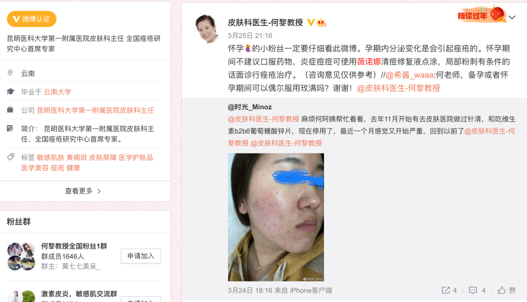 这位在微博上拥有55万粉丝的医学教授几乎毫不避讳地为薇诺娜系列产品做宣传。时常有皮肤病患者在微博上求助和咨询皮肤问题,她会推荐对方使用“薇诺娜清痘修复液”治疗炎症痘痘。