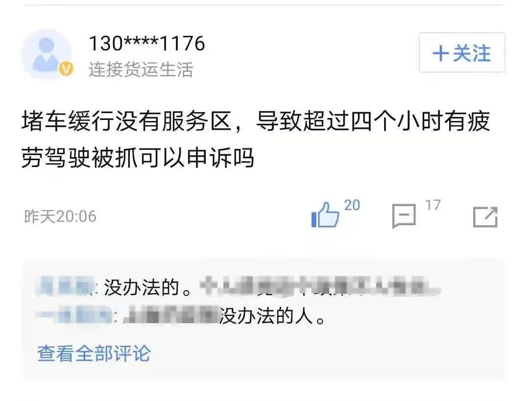 北斗盒子带来的恐惧就像一把利刃悬在司机们的头顶。徐鹏听到盒子发出的疲劳驾驶提示音就会感到焦躁。他开货车7年,曾因疲劳驾驶被罚,交了200元罚款、扣了6分。去年5月中旬,他经历了惊心动魄的一分钟。他从武汉去往长沙,在离长沙李家塘高速出口10公里的地方,堵车了,车辆密密麻麻地排在路上。行驶时间到3个半小时后,车内响起了北斗盒子“疲劳驾驶”的语音提示。根据相关条例显示,驾驶机动车不得有超过4小时未停车休息,或者停车休息少于20分钟的行为。提示语音每五分钟重复一次。徐鹏听得焦躁不安,他时不时把头伸向窗外,观察车队变化。脚也从未离开油门,他不想错过任何缝隙,尽可能地把车往前挪。时间一点点流逝,徐鹏觉得自己离“交200元、扣6分”越来越近。最终,在行驶到4小时的前一分钟,徐鹏开出高速后,立马到路边停车熄火。公安部曾发文称,存在道路交通事故、交通拥堵、恶劣天气等客观原因,导致驾驶人长时间滞留在路上,未能及时停车休息等情形的,不认定为疲劳驾驶。即使收到了罚单,也可提出申诉。徐鹏知道这项规定,也听闻有卡友申诉成功过。但是一打听,申诉得跑一周,对于货车司机们来说,时间就是金钱。花费一周去处理申诉,就意味着少了出车赚钱的可能。卡车论坛上,有人询问,“堵车造成的疲劳驾驶可以申诉吗?”下面卡友一致评论:没办法的。北斗盒子的设计一大初衷是为了提醒、监测司机们的疲劳驾驶。但这套系统的严格执行,让司机们走向适得其反的一面。可比起申诉,他们大多选择了逃避,这也让卡车司机路上的问题缺少了博弈的机制。