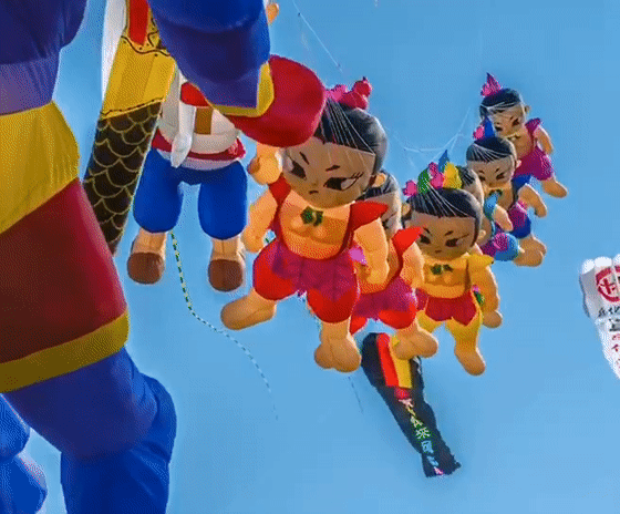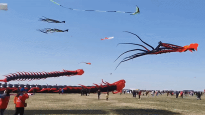 鲸鱼才是重头戏。这块上百亩的广阔地域,划分出了不同的风筝竞赛区域,但神奇的是,每个区域飞到天上的风筝中都有海洋生物。有几十米长的粉色章鱼,有头黄背绿的热带鱼,有红色的鳐鱼,还有白色的水母……这让蓝色天空像是一片生机勃勃的海洋。当然,也有人觉得这像是堆上天的一桌巨大海鲜,以及海鲜的远亲们。