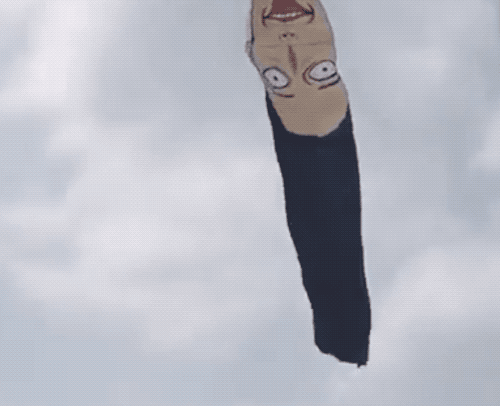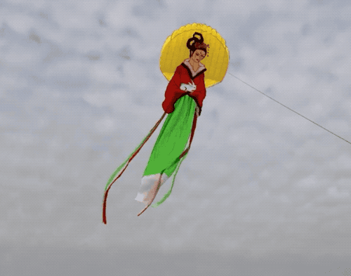 有好几个骑自行车的“年轻人”,靠一种新颖的技术,频繁地踏着,似乎永远在逆行;川剧里的变脸全家族也很难得地,排成一溜,同时出现。还有更能体现潍坊风筝节“怪”的特点的,比如埃及艳后和她的黑长直头发,一张倒挂的、被风吹得扭曲的人脸和只剩半截的下半身。