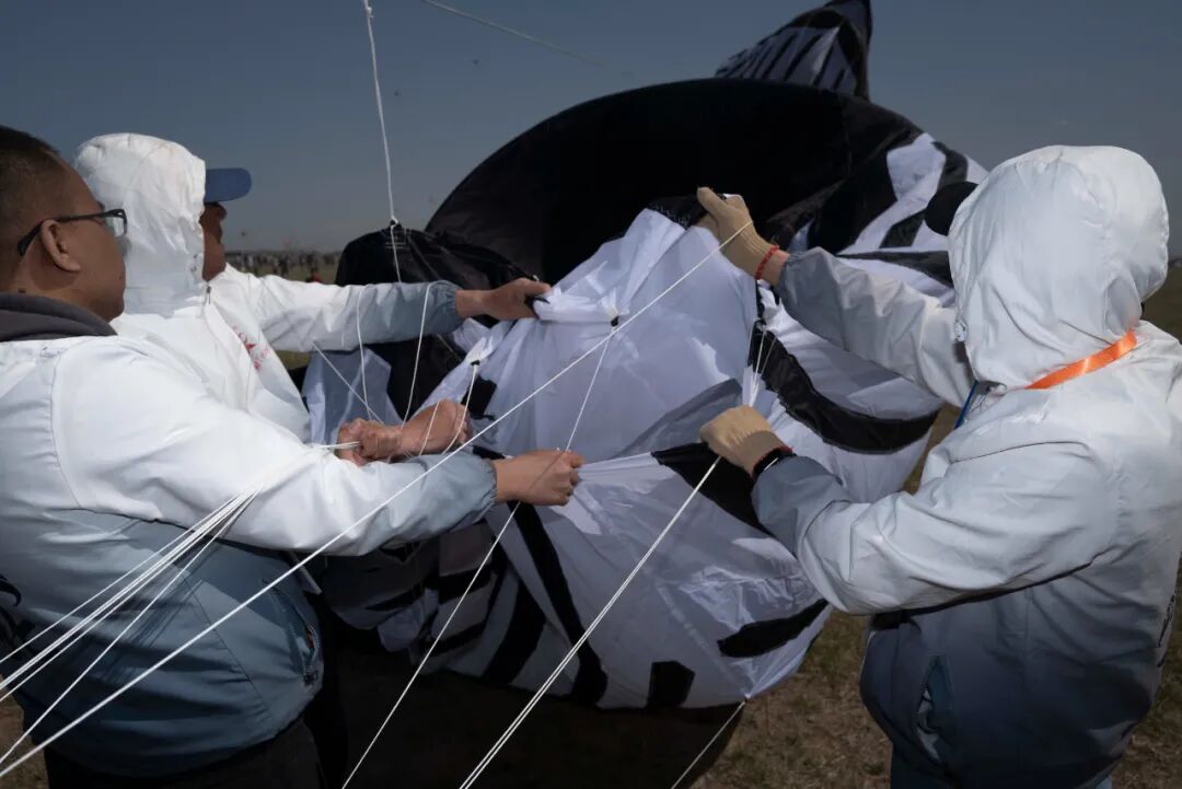 现在,海洋中的老大——鲸鱼要游动开来了。老魏和另一个人拉起鲸鱼的嘴,另外两个人在后面托着鲸鱼的尾巴。干瘪的鲸鱼花了5分钟时间吸收潍坊的风,从头到尾都鼓起来。老魏一手拽住6根粗线捆住的鲸鱼的头,另一手把金属扣固定在领航风筝的线上。