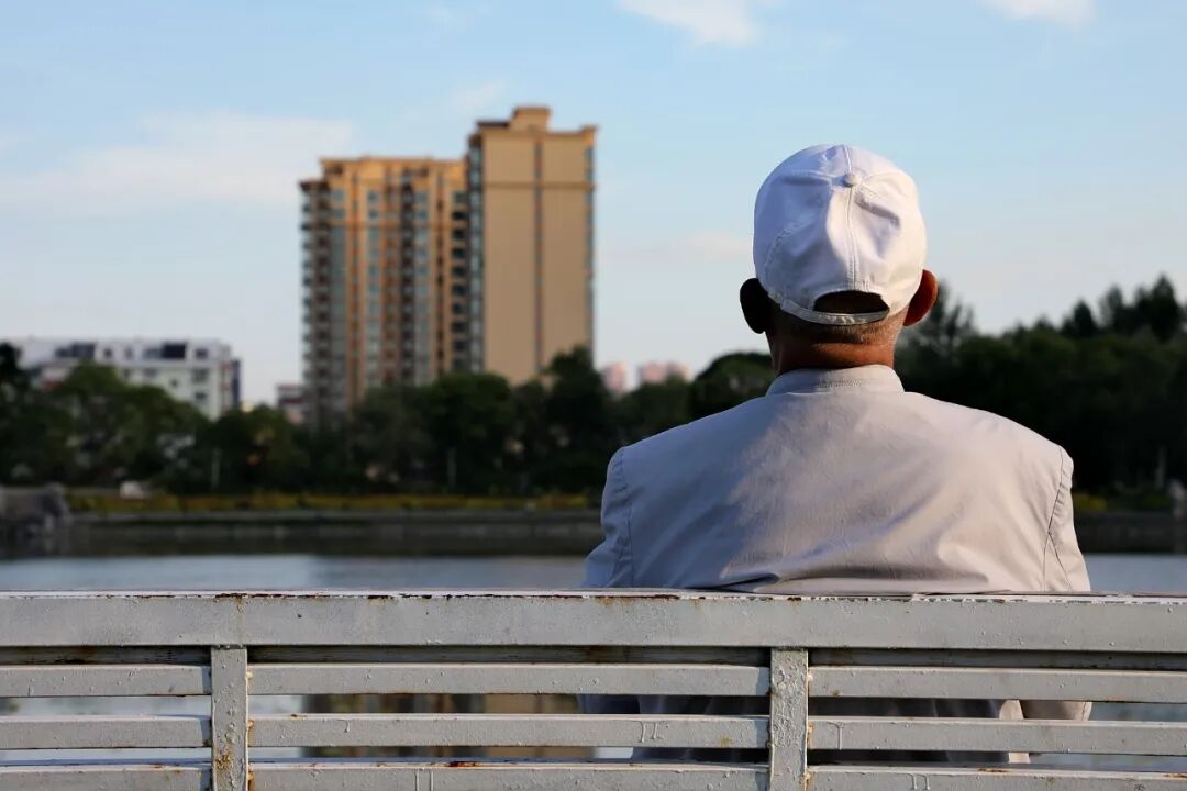 ▲ 鹤岗天水湖公园,一位老人坐在长椅上看着远处的房子。图 / cfp