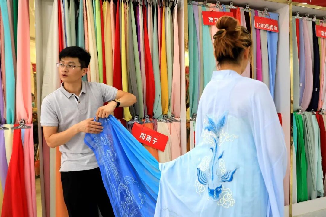 ▲ 曹县一位商家在介绍古风服饰的面料。图 / cfp