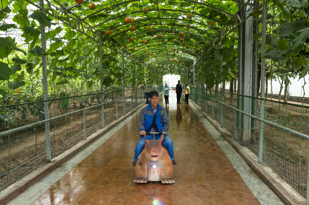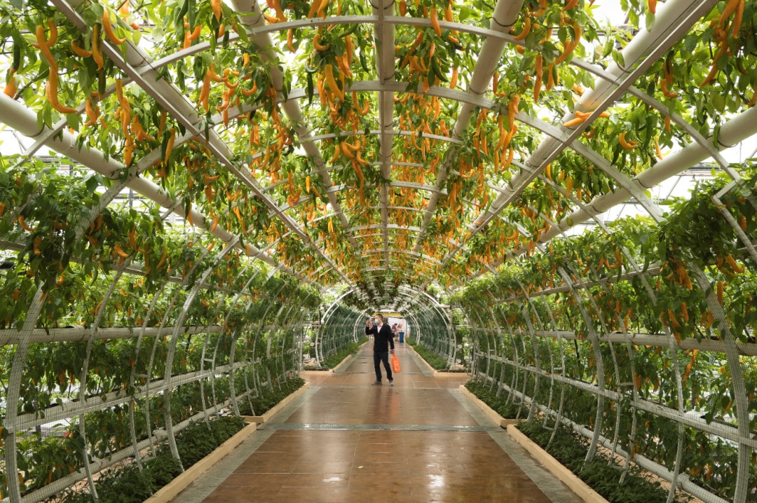 这之后,上天的番茄树和巨大的单体南瓜逐渐成为主角,也成为了寿光走出去的名片。在寿光,人们说起蔬菜种植会有一种自豪感,“我们每个寿光人,或多或少都跟蔬菜产业有些关联。”当地的一个出租车司机说。他自己开出租的同时,也在卖肥料,宣传自家肥料时的话术是,“施了我家的肥,蔬菜会长得又大又多。”为了“又大又多”这个目标,寿光人没少琢磨。比如有个叫姜国栋的种辣椒的农民,别人一颗辣椒能收十多斤顶天了,他琢磨出一种方法:一株辣椒结出的第一个果实叫“门椒”,门椒之后,每产一颗,他就动手把辣椒尖给掐了,让辣椒的营养集中到坐果上。这是个辛苦活儿,一亩地几千株辣椒,每一株都要亲自动手掐尖,而且每株辣椒都要掐多次。但是收效也喜人,他能让一株辣椒产二十多斤。原本只要有土,没有什么奇迹是寿光人民创造不出来的。但为了把蔬菜种得又大又多,他们还把种植业和水产养殖业结合了起来。在菜博会上,有一块特殊的空间留给鱼池。鱼池里鱼的排泄物经过水泵,打到二层种植的芹菜、生菜、空心菜等水生性强的叶菜类根系中。这些蔬菜全部采用水培或是壁挂栽培的方式,“生长速度比在土壤中快3倍,只要有合适的温度,一年四季都能生长”。这个共生系统实现了研发者杨希洲的梦想,“养鱼不换水,种菜不施肥”。穿梭于菜博会的展馆之间,你会发现,无论是长得大的巨人南瓜,还是产量高的番茄树,又或者是鱼水共生系统,其实都体现了同一个愿景——即在有限的空间里,生长出更多的蔬菜。寿光人对繁茂的孜孜渴求,成为了这场朋克之旅的重要注脚。
