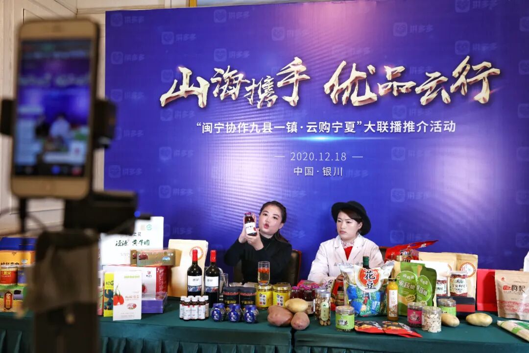 ▲闽宁禾美电商扶贫车间负责人徐美佳(左)和“巧媳妇”直播团队主播马燕在拼多多直播间推介宁夏特产。图 / 小安