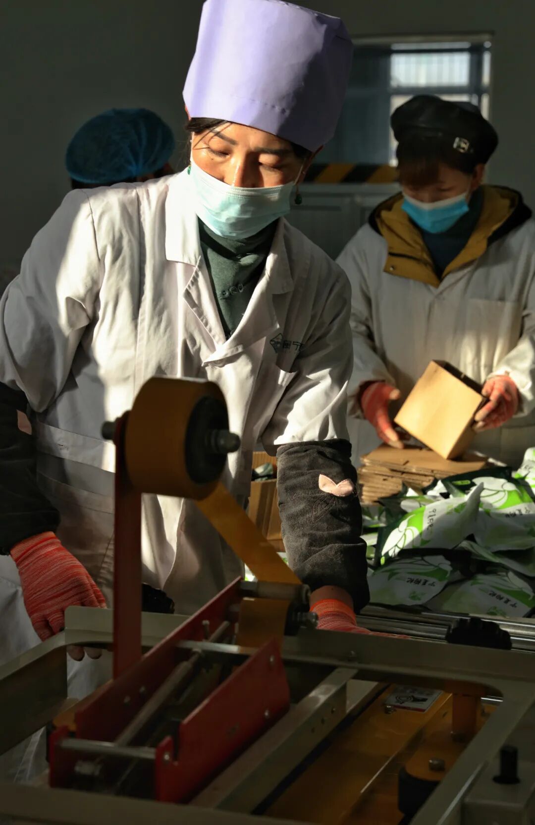 ▲扶贫车间的女工们认真地打包货品,她们多是闽宁镇原隆村的回族妇女,丈夫在外打工,独自抚养孩子,如今通过“家门口就业”实现了某种意义上的女性独立。图 / 顺子