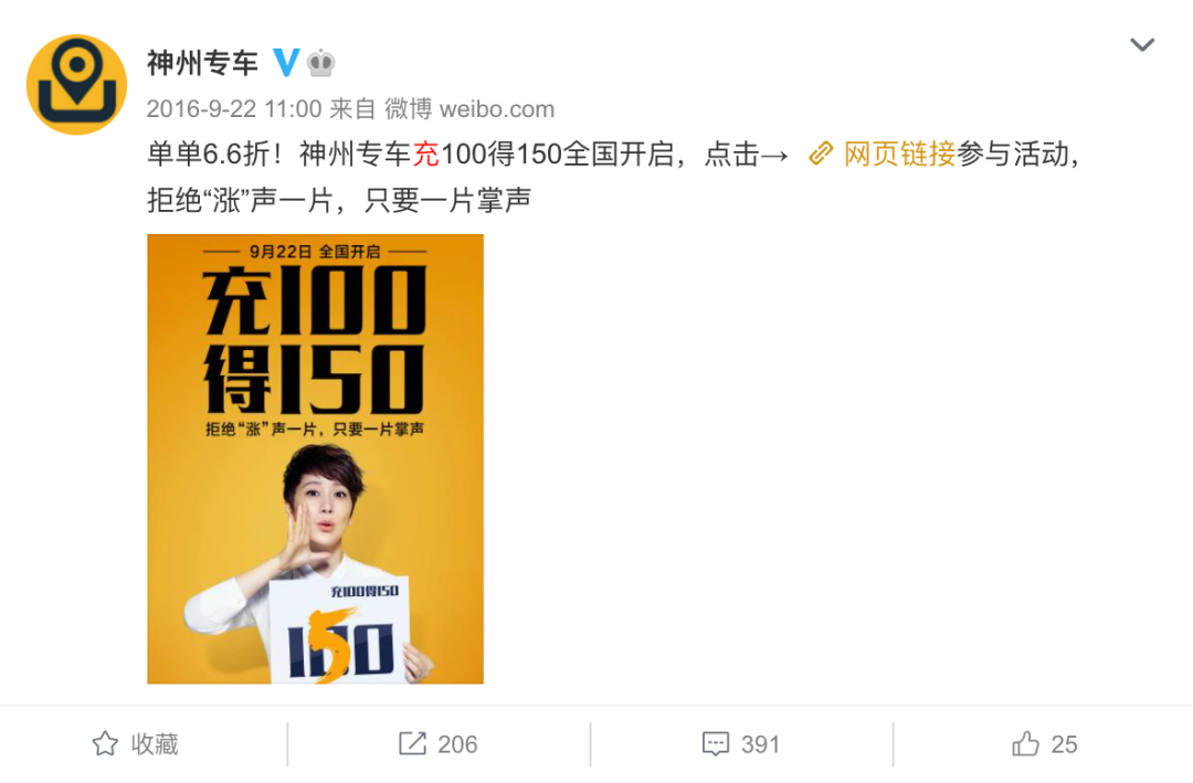 ▲ 神州专车2016年充值100补贴150活动。图 / 微博@神州专车