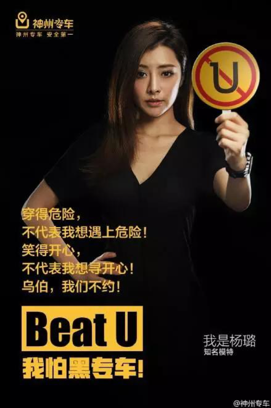 在海报里,代言人吴秀波、海清、模特杨璐等人举着一个黄色的圆牌,里面写着一个大写的“U”,用红色画了个圈,打了个叉。海报的右下方配着一段文字:“家里十个好叔叔,也斗不过车里的一个怪蜀黍。不心存侥幸,就不会身处险境!我怕黑专车!”甚至神州专车还在官方微博中发文:乌伯,请停下你的黑专车!
