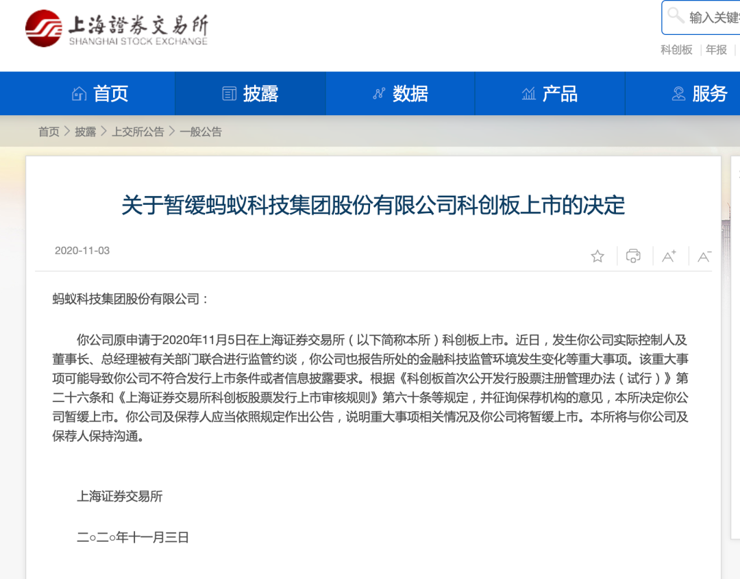 ▲ 上交所关于暂缓蚂蚁集团上市公告。图 / 上海证券交易所