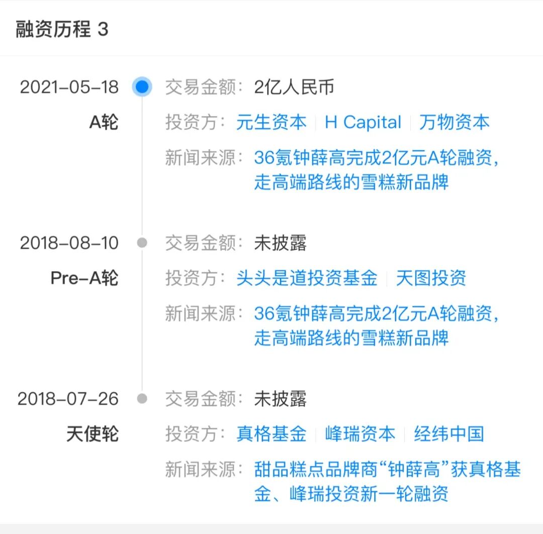 制造过“神话”的钟薛高自然也迎来了众多资本的看好。今年5月18日,钟薛高完成2亿人民币A轮融资,投资方为元生资本(领投)、H Capital、万物资本、天图投资。
