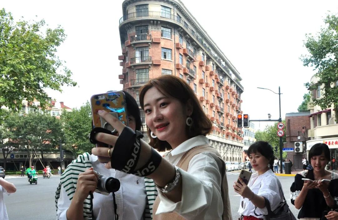 到了午后,同样的位置,低头向下,有拍婚纱照的,有拍旗袍名媛风的,还有人把相机朝着楼上对焦。街道被游客里三层外三层充满,还有一块一块的、由不同帽子颜色构成的人群,都是旅游团,导游举着喇叭喊:我们现在所在的地方就是上海的十大网红打卡地之一……