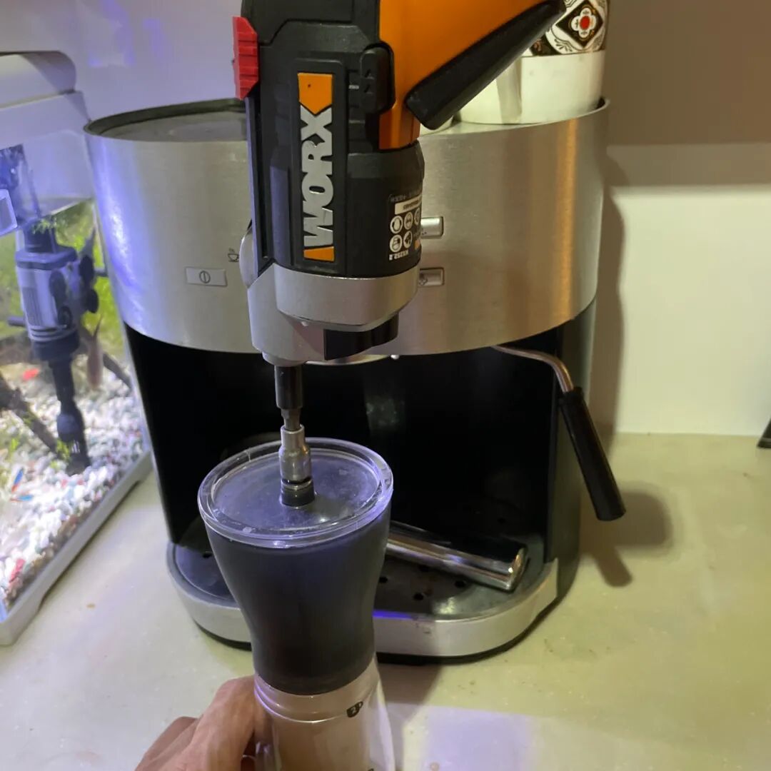 想喝咖啡买了个手摇磨豆机,但是弄了一次觉得太费事了效率极低。买个电动的又太贵,于是找了把电动螺丝刀,加了一个转换头上去,成功升级为电动手持磨豆机。真的好用,转速稳定,出粉快速。