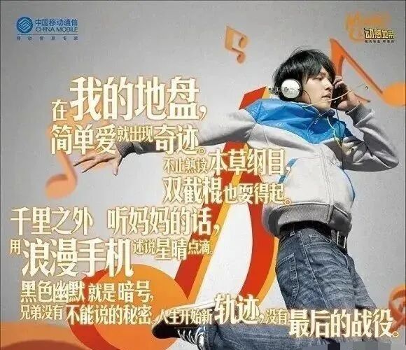 最重要的一个代言发生在2003年,中国移动推出面向年轻人的“动感地带(M-zone)”品牌,并牵手周杰伦。那张映着“我的地盘听我的”的橙色海报贴满大街小巷,歌迷们哼着周杰伦的《我的地盘》加入移动的2G套餐,成为M-zone人。