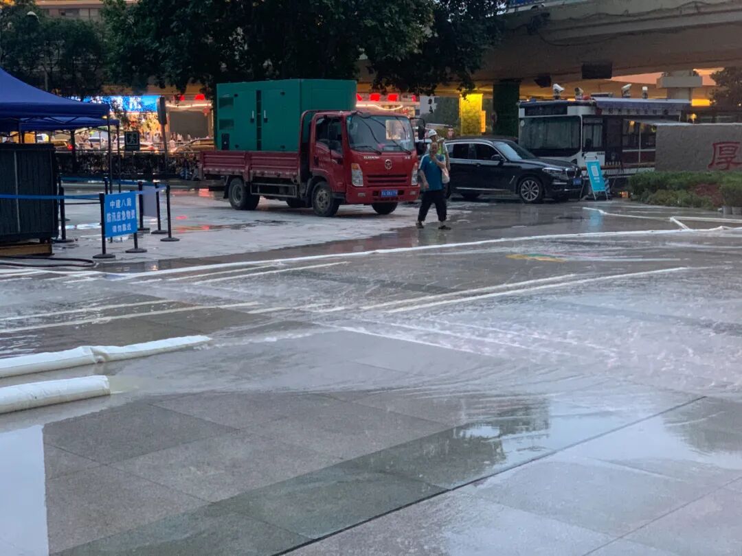 她起身看了一眼窗外,2号楼的灯还亮着,“雨下得特别大”。这一次看窗外的时候,医院建新大楼的建筑工地里还能看到铲车,过了一两个小时,她再看,发现“水就全满了”,建筑工地变成了一个大水坑,铲车只剩个顶。