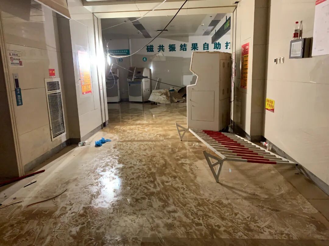 但地下三层依然停电。水已经抽干,通往地下的楼梯间,墙体变成了泥的黄色,负一层的核磁共振中心还是狼藉一片,地上是泥和水的混合体,天花板也还在漏水,机器四散在大厅里。医院的工作人员在把液化氮往楼上运,每个大楼的电梯只恢复了一两部。急诊中心已经有新的病人开始入住,但停电最早的一号楼依然不允许医护人员以外的人进入。