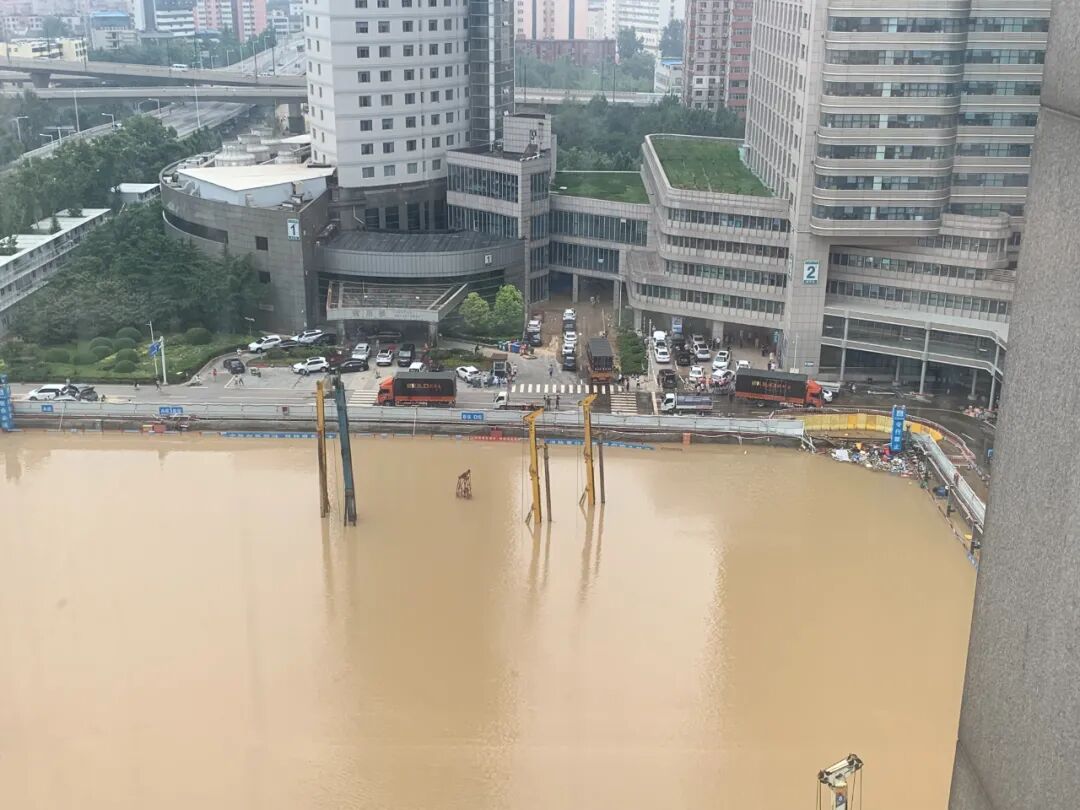 这条预警发出来一个小时后,暴雨造成的积水就侵袭了郑大一附院的电力系统。林霞所在的1号楼正处在郑大一附院的东北角,东边是金水河,北边挨着建设路。郑大一附院院长刘章锁接受“紧急呼叫”采访时称,河水倒灌,金水河的河水往回流,引起积水。1号楼的保洁跟医生护士一起拿着枕头和棉被往一楼跑,把棉被堵在大门口,不让水继续往大厅里渗。但面对暴雨,这并没有起到什么作用。