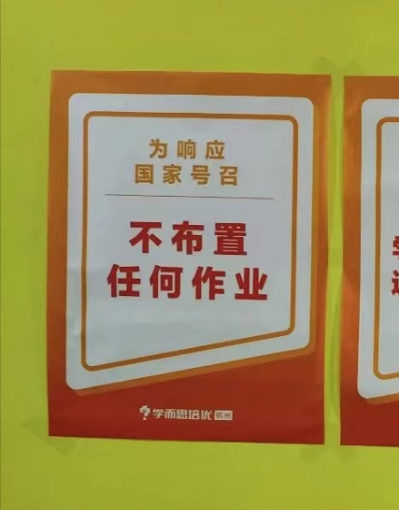 有的人被裁员,有的仍在坚持,但无论哪一种,所有人都面临一件共同的事——改变。比如主讲老师刘柳,她不得不接受一些新的“不能说的东西”,有时那些话差点就到了嘴边。“现在已经不让提任何作业了,包括打卡、读课文,就连背单词也不行。监管人员随时抽查监控,抓到一个违规,那整个团队就完了。”就连一些作业的提法也发生了改变。在以前,数学作业叫课后巩固,现在叫“好题选讲”,以前语文作业叫“精益求精”,现在是“封面和课本一样的薄一点的小册子”。这甚至引发了一些家长的不满:如果没有作业,那孩子还怎么巩固学习?比如决定退课的家长刘莹,她说,在过去,学而思培优发的题是厚厚一摞,有课后巩固题、加油站、挑战题、各种卷子……现在,变成了只发一本——作业消失了。刘莹甚至看到,在机构内的墙上,已经贴上了崭新的红色海报。这些海报是”求生欲“的象征,以加粗的字体写着:“为响应国家号召,不布置任何作业”。