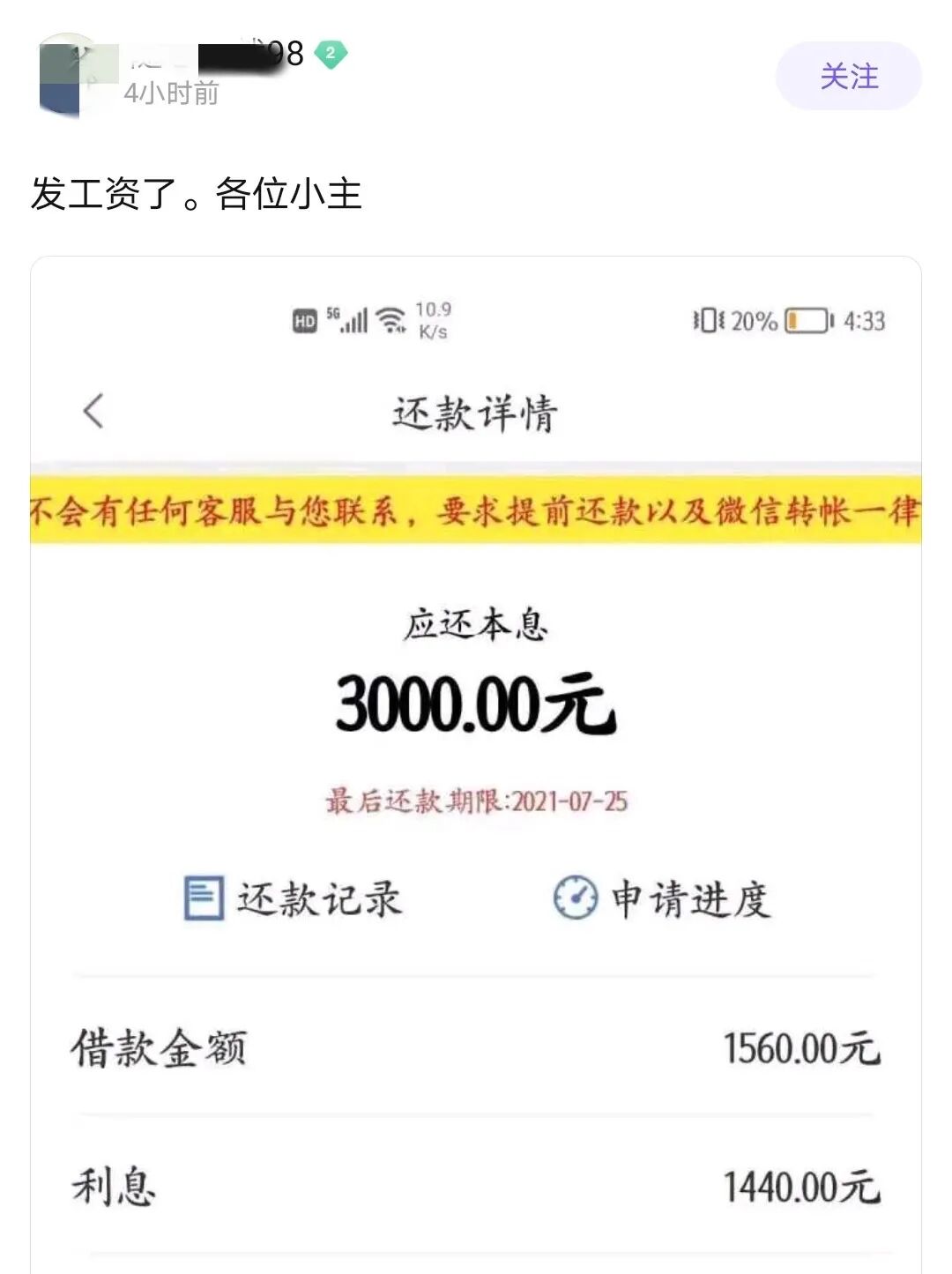 每当出现新的“口子”,就有人在贴吧和群聊中说“又有口子放水了”,大家一拥而上去借钱,但没有人打算还钱。阿金解释,“征信没了,通讯录爆完了,没有什么担心的事会再发生了,所以这些钱就是意外之财,平台放款就跟‘发工资’一样。”