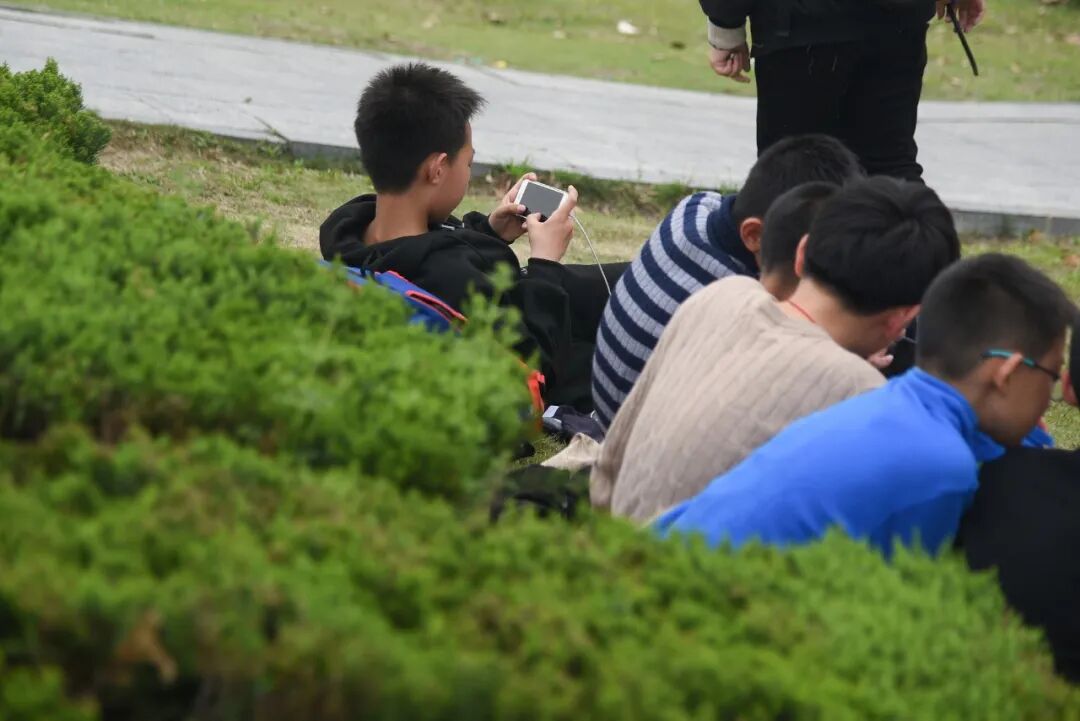 ▲ 杭州一公园内,几个孩子们聚在一起刷手机打游戏、看视频。图 / 视觉中国