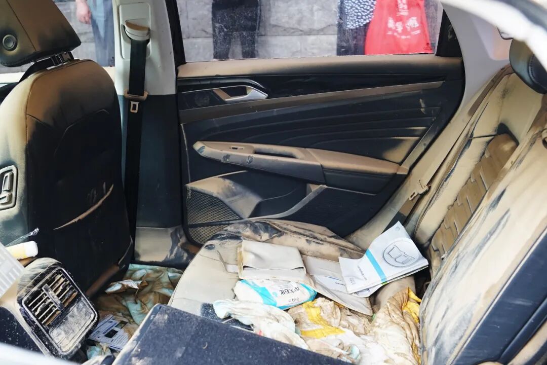 ▲ 暴雨后,被水泡过的车内被黄泥覆盖。