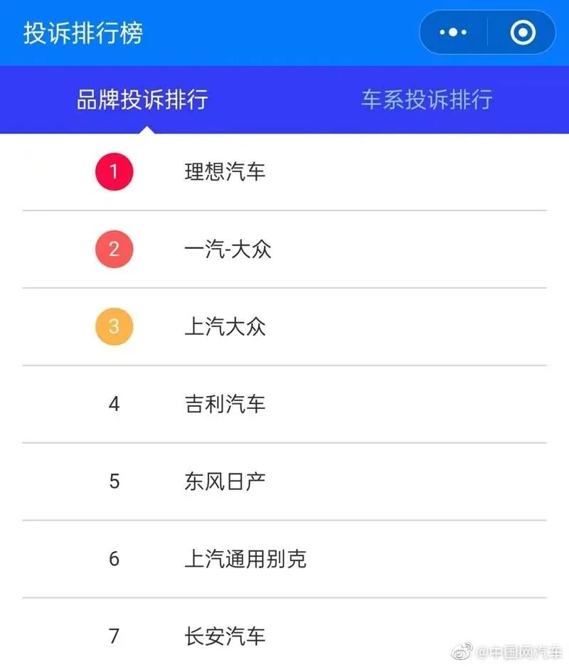▲ 理想汽车位于“品牌投诉排行榜”第一位 图 / 中国网汽车官方微博