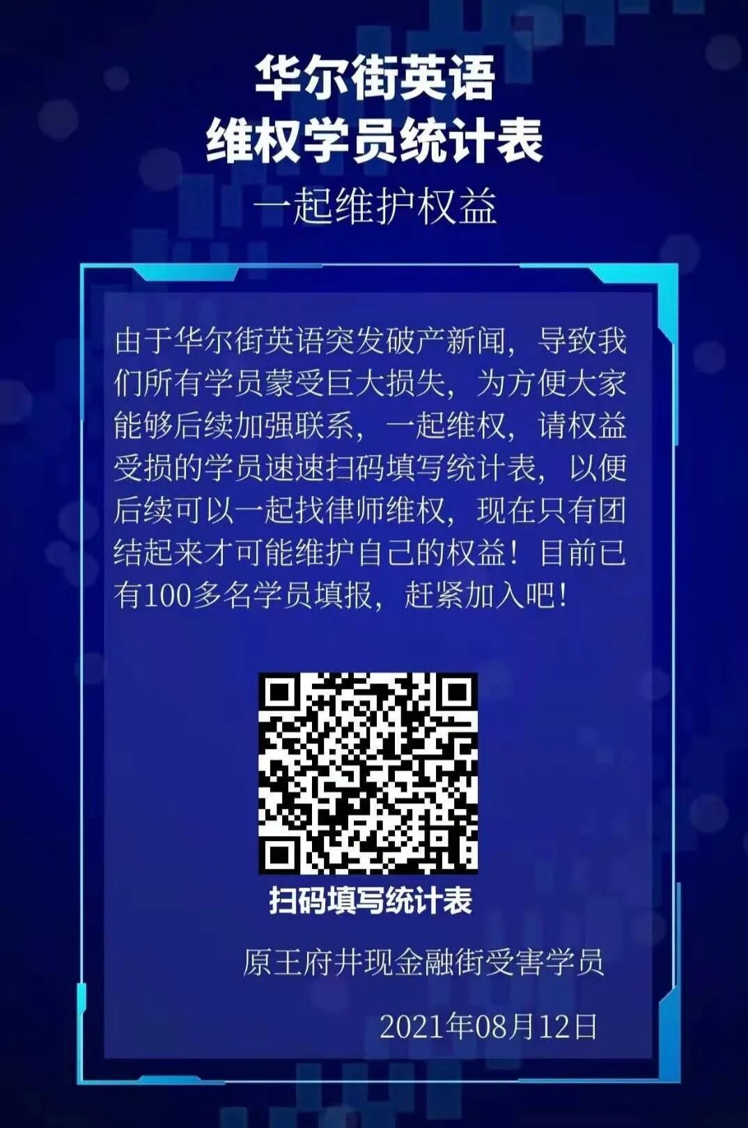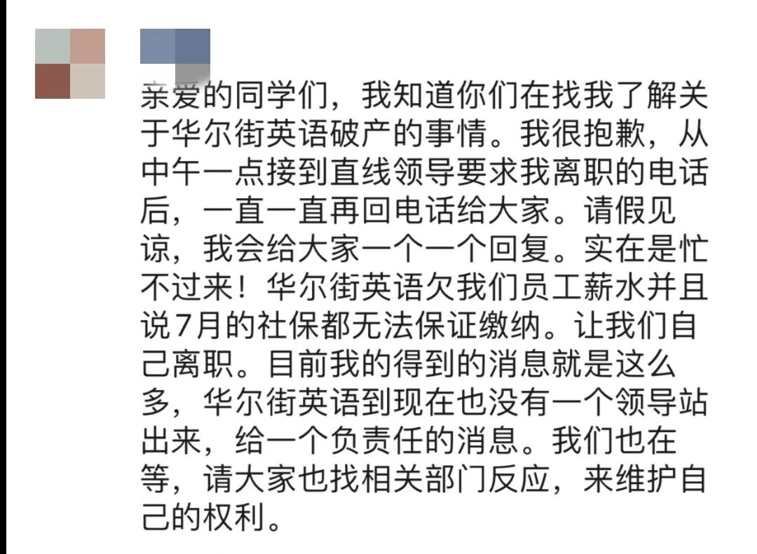 辛辛剩余的学费在群里算是起步价,比重较多的是8万-13万之间,有VVIP学员的学费高达36万元。 一下午的时间,辛辛先打了12345的投诉热线,又去了所在辖区的派出所。被告知“不归我们管”后按照指引去了工商所,但工商所工作人员回复“对接不上华尔街英语员工,无法协调”。最后,她只能前往朝阳区法院起诉。 法院门口的队排得很长,一位工作人员建议大家在网上提起诉讼。有着共同诉求的她们一边建群、一边往里拉人,有起诉成功的学员在群里教其他人相关流程。 辛辛知道,维权成功的希望不大。合同中有一条,“鉴于本合同系续学合同,且乙方已接受了价格优惠,则此后除发生法律规定可以解除本续学合同的情形外,乙方要求解除本续学合同的,学费一律不予退还”。 但她们还是想试一试,也已经联系了负责不良资产的代理律师接管案子。“我就是想要回我的钱,哪怕是很少一部分。” 除学员外,突遭暴击的还有许多在职的员工。 Anna是华尔街英语的一名讲师,12号下班后,她突然收到了工作群中的离职消息,还有一份流传在各个小群中的“离职申请模板”,大意是说“由于拖欠本人2021年五月、六月、七月以及八月至今三个半月工资,导致本人家庭生活困难,依据《中华人民共和国劳动合同法》第三十八条,被迫解除劳动合同”。 这份声明打着“为员工着想”的旗号,但没有人能告诉她,拖欠的工资何时发、漏交的社保如何补,留下的只有人去楼空的学习中心和不断蹦出来的微信消息。 13号下午,一直联系不上高层领导的Anna和同事一起来到了北京朝阳区劳动人事仲裁院申请仲裁。工作人员对于华尔街英语员工的到来已经习惯,流畅地安排她们排队填表,他告诉Anna“从昨天到今天,来的几乎都是你们同一家公司的”。