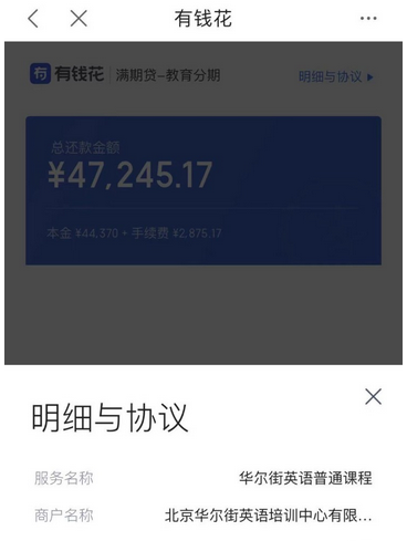 ▲ 某位学员针对华尔街英语的学费进行了互联网贷款,本金加上手续费总计近5万元。图 / 手机截图