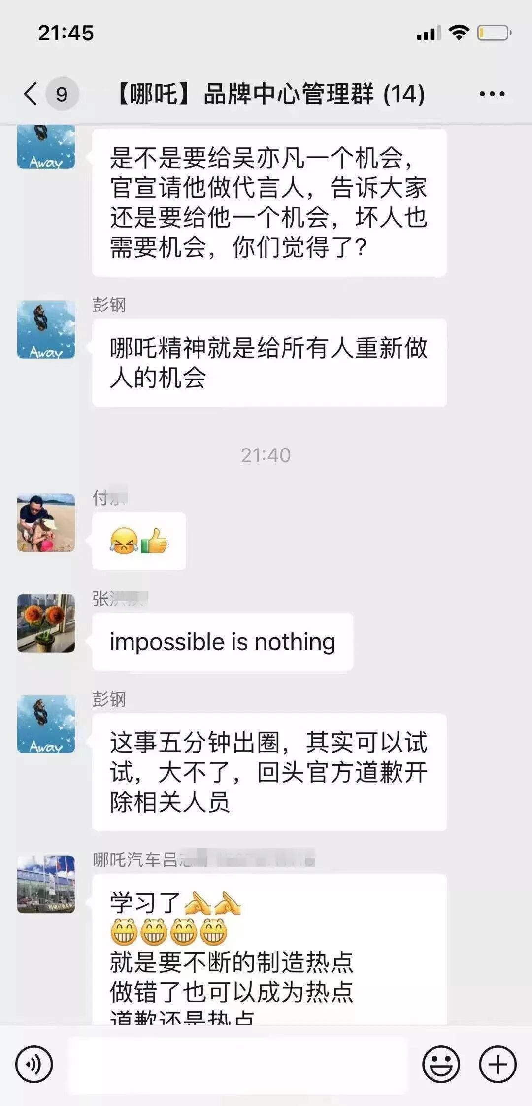 ▲ 哪吒汽车工作群内聊天记录(可上下滑动)。图 / 手机截图求锤得锤。舆论发酵后,哪吒汽车官方发声明道歉,而彭钢成了被开除的相关人员,最终这事也的确出了圈。值得注意的是,最早发布的声明中,彭钢的职位表述为“公司特别顾问”,但过了一段时间后被修改为“市场部负责人”。事发之后,哪吒汽车CEO张勇措辞严厉地表示,“这帮人觉得瞎炒作的代价无非就是开除一个临时工,我们的回应是把出这个主意的市场部负责人,和参与讨论并发表不当言论的半个品牌公关团队、负责人团体开除掉!”有网友在评论中调侃称,事后处理方式果然“跟群里说的一致”:先出圈,再制造热点,最后再道歉和开除相关人员。只是这样的热点,不蹭也罢。