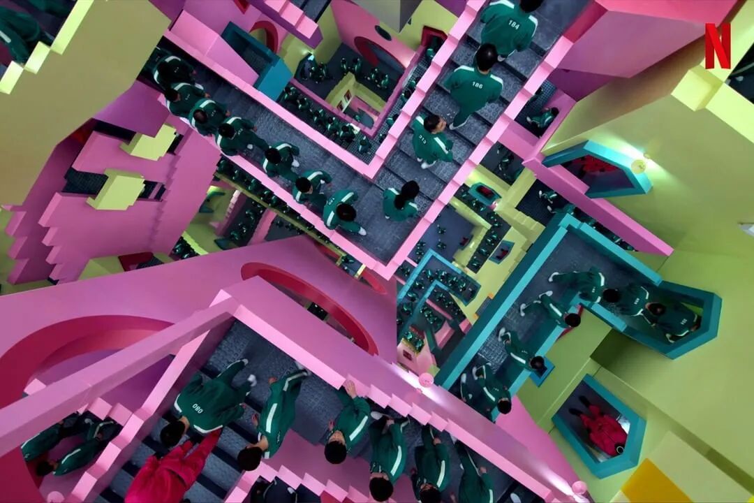 看过《鱿鱼游戏》的观众都知道,每一轮游戏开始的时候,幸存者都会在毫无感情可言的人肉播音机引导下走过高高低低的台阶,建筑物是各种梦幻的马卡龙色,就像穿行在冰棒中,或者身处高端幼儿园教室。