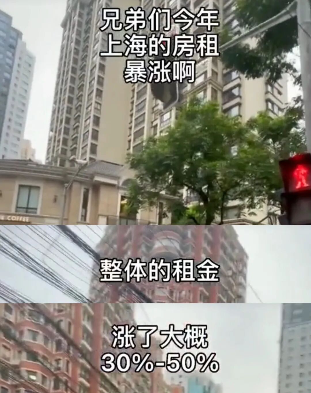 这是共性问题,从今年六七月开始,许多租客都收到了房东涨价的通知。一个广为流传的视频是,一名房产中介站在嘉善路的十字路口,先指了指右边的房子,“去年4万,今年要5万多,甚至6万”,再指着左边的房子,“一个三房去年1万多,今年装修好了要3万”,接着指向远处的老破小,“60平米也要1万”。他最后得出结论,“这边的房子整体租金涨了30%到50%”。